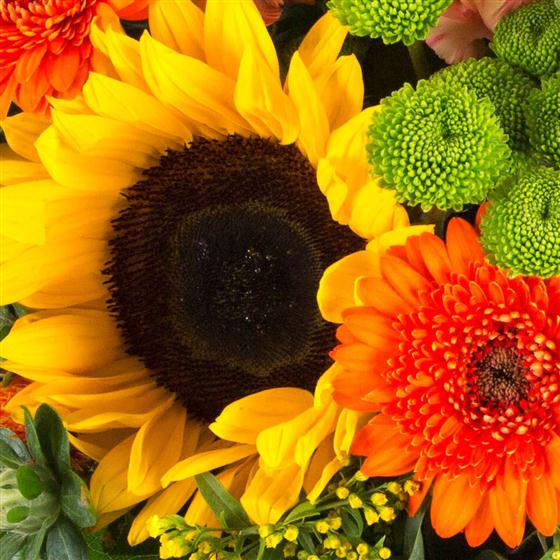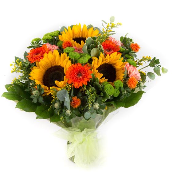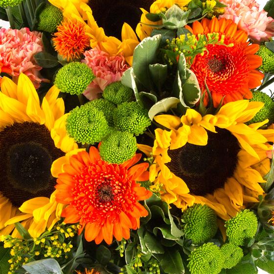 Sunflowers are the focal point of this dazzling, citrus hand-tied bouquet. To avoid disappointment please contact us to confirm sunflower availability.