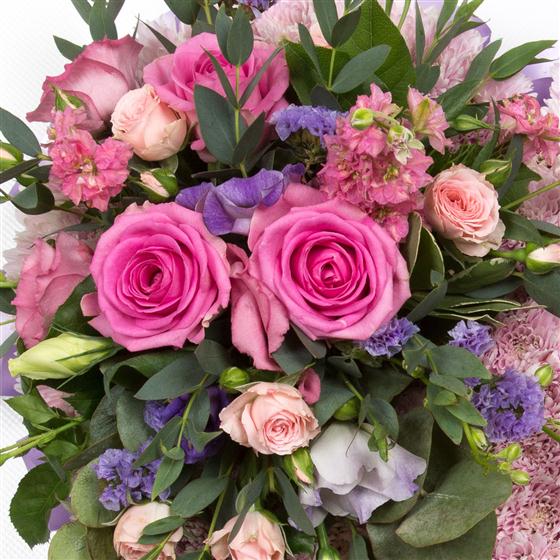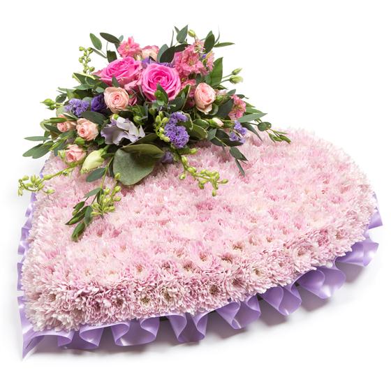 A feminine, heart shaped tribute created using a base of pink chrysanthemums with a delicate spray of lilacs and pinks including roses and larkspur.