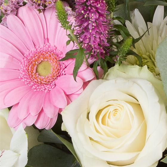 A delightful arrangement in pastel pinks and creams, including roses, veronica, mini gerberas and eucalyptus.