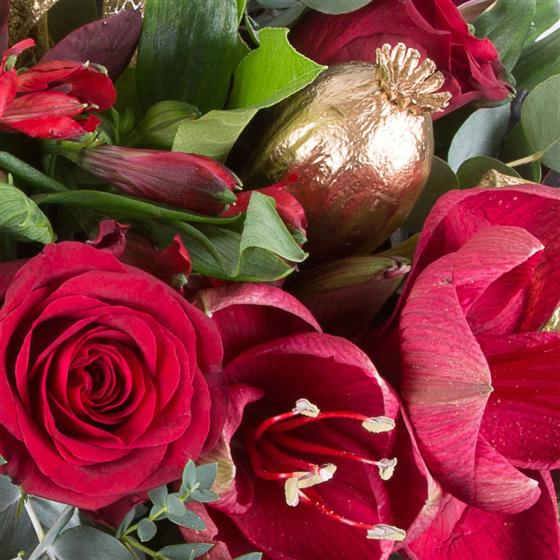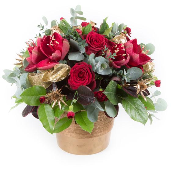 This beautiful arrangement includes red roses and spray red roses with a selection of seasonal foliage. Cones and gold clusters give this arrangement a stylish festive feel.